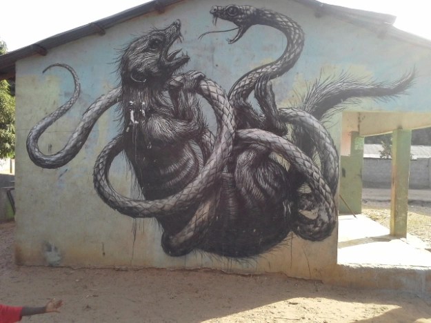 Lawrence Williams een Brit heeft dit project 9 jaar geleden opgezet. Hij heeft wereldberoemde street-arts bereid gevonden om schitterende muurschilderingen te creeren op huisjes waar de Fula’s wonen. De bedoeling van dit project is om de plaatselijke bevolking blijvend te ondersteunen. Deze muurschilderingen zijn een schouwspel om naar te kijken.